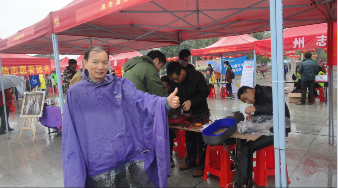 ▲肇慶市民冒雨為風華高科志愿者義務維修隊點贊