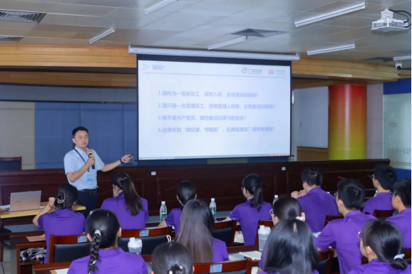 公司黨委委員、紀(jì)委書記、監(jiān)事會主席丘旭明以《堅(jiān)持廉潔從業(yè),扣好“第一粒扣子”》為題,對全體新員工開展了一場從業(yè)廉潔教育培訓(xùn)。他以發(fā)問形式引導(dǎo)大家進(jìn)入廉潔思考,以警示教育片切入課程內(nèi)容,從業(yè)的重要意義、主要規(guī)定、如何扣好廉潔從業(yè)“第一??圩印比矫孢M(jìn)行了課程講授。