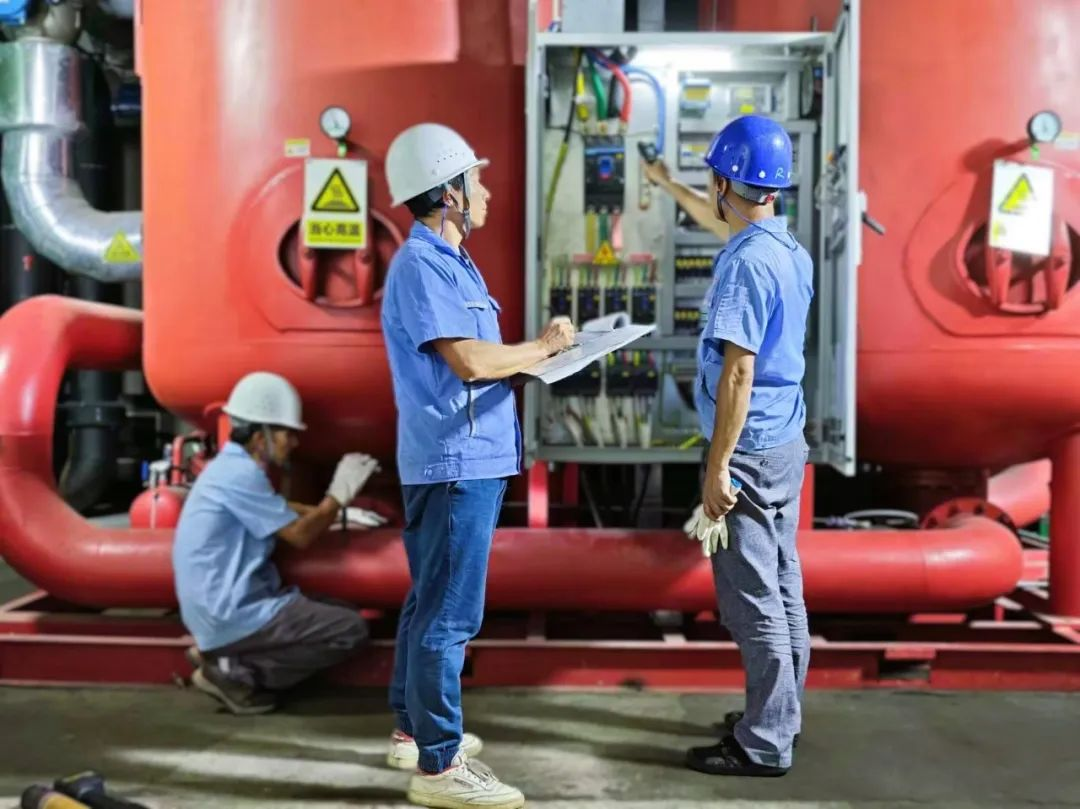 ▲風(fēng)華高科工作人員對(duì)空壓機(jī)配電設(shè)施測(cè)溫及閥門(mén)狀態(tài)檢查