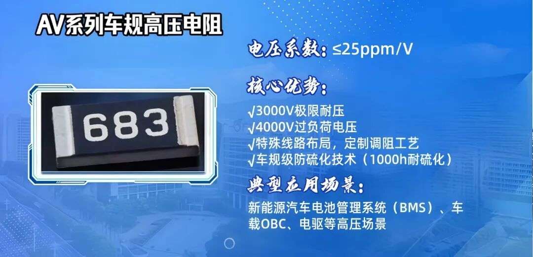 AV系列車規(guī)高壓電阻:該產(chǎn)品突破了常規(guī)車規(guī)電阻的耐壓極限,通過創(chuàng)新的線路布局設計、定制化調(diào)阻工藝及車規(guī)級防硫化技術,在新能源汽車電池管理系統(tǒng)、車載充電器及電驅系統(tǒng)等高壓高頻應用場景中,仍能保持卓越的電氣穩(wěn)定性與耐久性。