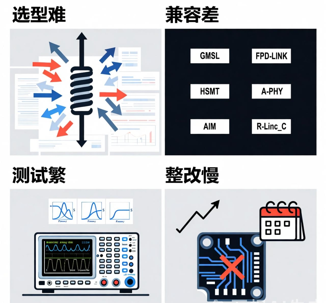 ?兼容差:GMSL、FPD-Link、HSMT等主流芯片協(xié)議層出不窮,各協(xié)議對S參數頻率響應要求各異,方案難以通用,設計周期長。